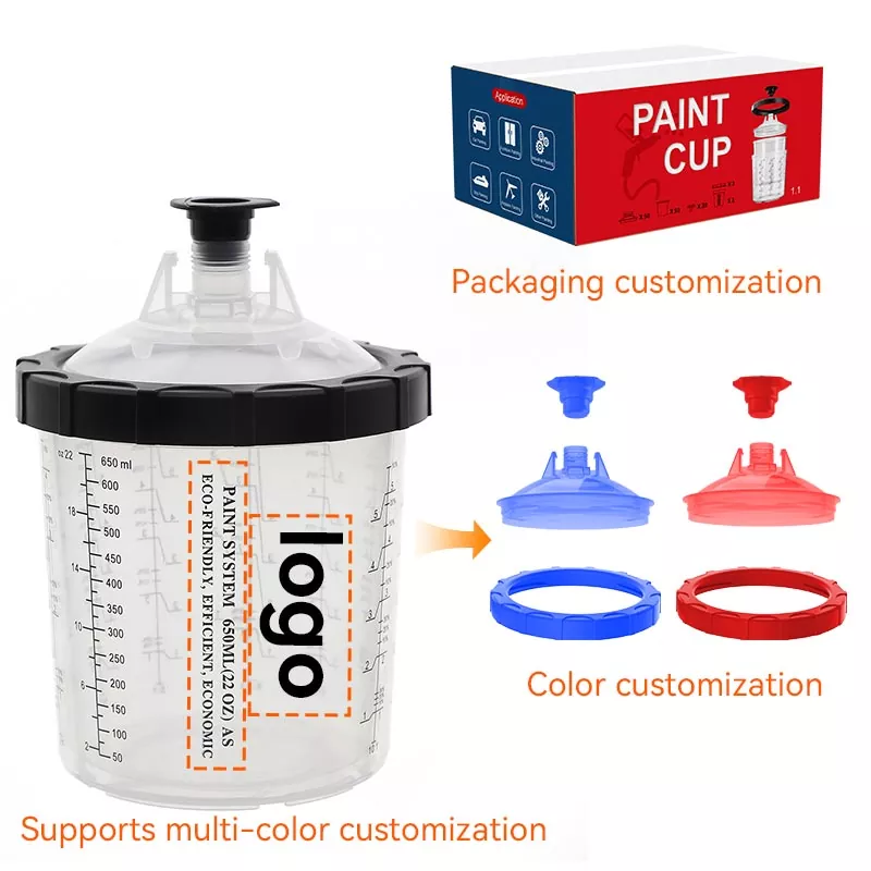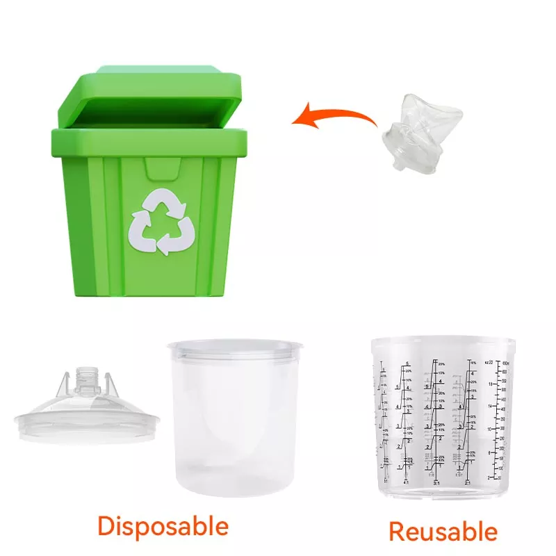 Hệ thống cốc sơn dùng một lần 600ML 1.0 là cốc tiêu chuẩn linh hoạt nhất phù hợp với các khu vực phun vật liệu từ 22 fl oz trở xuống. AYSPAT cung cấp nhiều hệ thống cốc PPS với thiết kế khác nhau để bạn lựa chọn và cũng có thể được tùy chỉnh để đáp ứng nhu cầu của bạn: Cốc bên ngoài có thể được tùy chỉnh với logo và tỷ lệ thương hiệu của bạn, đồng thời nắp có thể được tùy chỉnh theo màu sắc và loại bộ lọc. Chúng tôi cam kết phát triển các hệ thống cốc phun dùng một lần hiệu quả và tiện lợi hơn để giúp các họa sĩ hoàn thành công việc vẽ tranh của mình một cách chuyên nghiệp và hiệu quả.