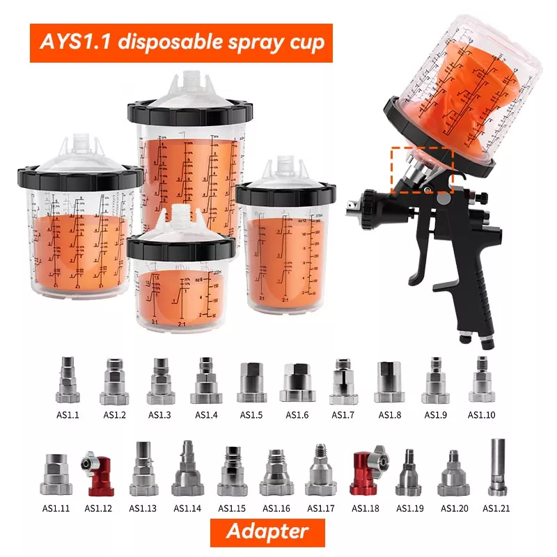 Cốc xịt dùng một lần AYS1.1 tương thích với bộ chuyển đổi dòng PPS1.0. Với bộ chuyển đổi, nó có thể thích ứng hoàn hảo với bất kỳ nhãn hiệu súng phun nào và có thể sử dụng ở mọi vị trí mà không có nguy cơ sơn nhỏ giọt.