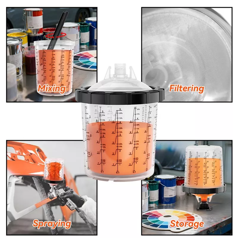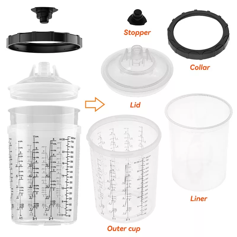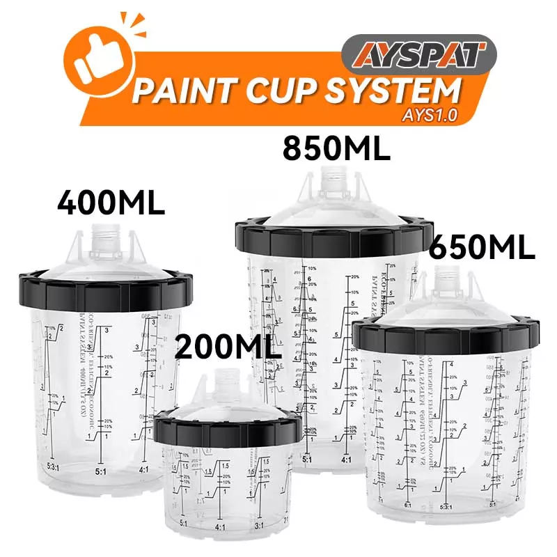 Hệ thống cốc sơn dùng một lần 800ML 1.0 giúp việc trộn và phun sơn trở nên dễ dàng và thuận tiện, đồng thời đơn giản hóa việc dọn dẹp và bảo quản sơn. Không còn phải chuyển sản phẩm vào các thùng chứa riêng biệt—chỉ cần sử dụngcốc bên trong dùng một lầnđể trộn, phun và bảo quản các màu sơn khác nhau một cách riêng biệt, loại bỏ hiện tượng bắn tung tóe sơn. Giải pháp cốc phun dùng một lần AYSPAT được thiết kế để thay đổi màu sắc thường xuyên, giảm thời gian làm sạch và sử dụng dung môi.
