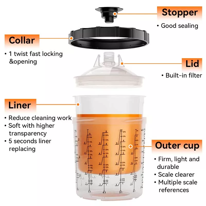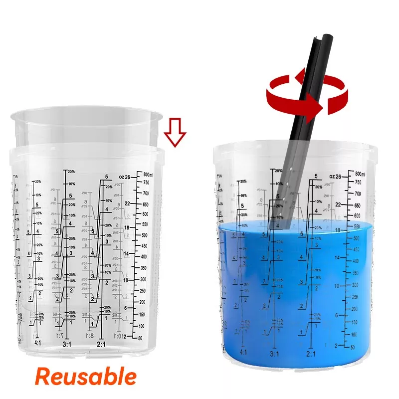 Cốc ngoài có thể tái sử dụng với thang tỷ lệ pha trộn. Chèn lớp lót dùng một lần vào cốc bên ngoài và trộn sơn trực tiếp vào lớp lót. Giảm chi phí vật liệu bằng cách không sử dụng cốc trộn truyền thống.