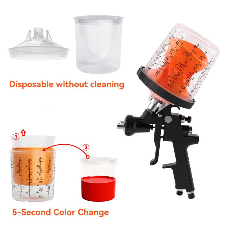 cáccốc súng phun dùng một lần không cần vệ sinh sau khi sử dụng; chỉ cần loại bỏ cốc bên trong để nhanh chóng thay đổi màu sắc, giảm khoảng thời gian thay đổi màu từ 20 phút xuống còn 5 giây, tăng gấp đôi hiệu quả sản lượng hàng ngày. Nắp có bộ lọc mịn tích hợp để lọc tạp chất hiệu quả, đảm bảo phun đồng đều và mịn, mang lại chất lượng hoàn thiện cao hơn.